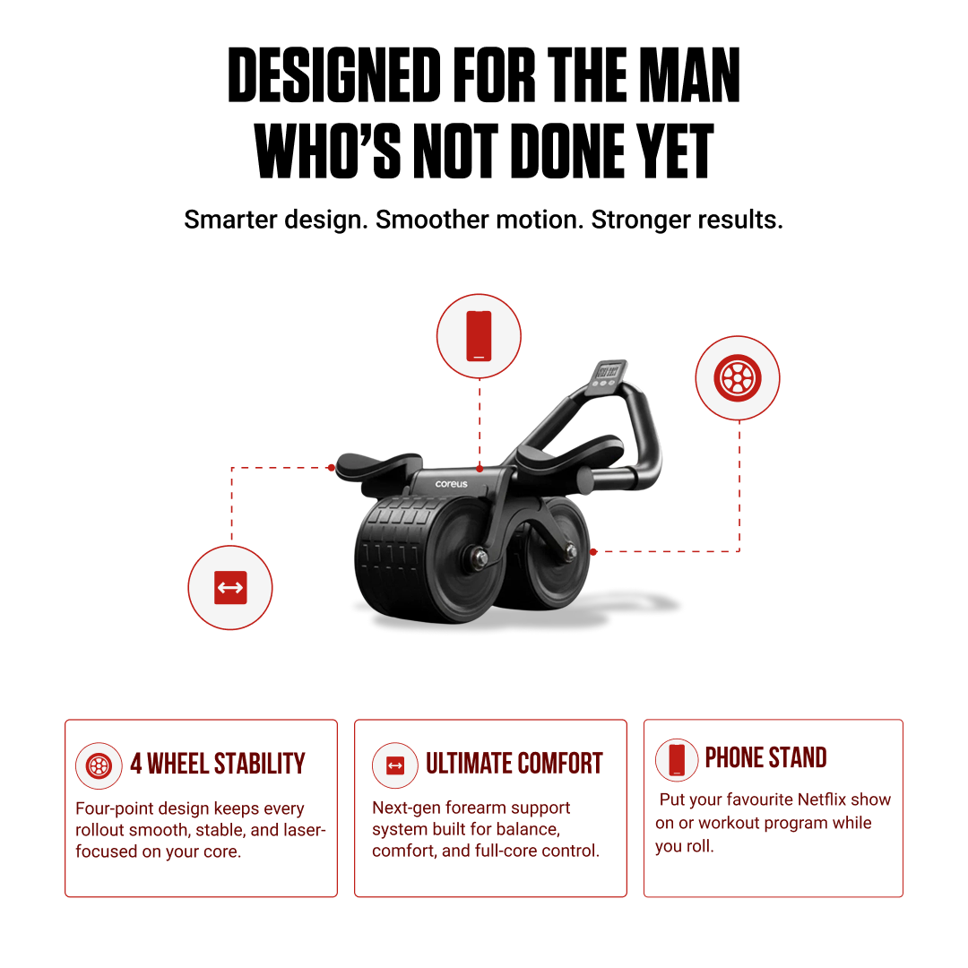 Beginner, intermediate, or gym-rat—COREUS makes it easy to start and progress. The Dual wheel base gives stability when learning proper form, while the extended roll range lets advanced users push deeper and harder as they improve. No steep learning curve. No frustration. Just real core training at your pace.